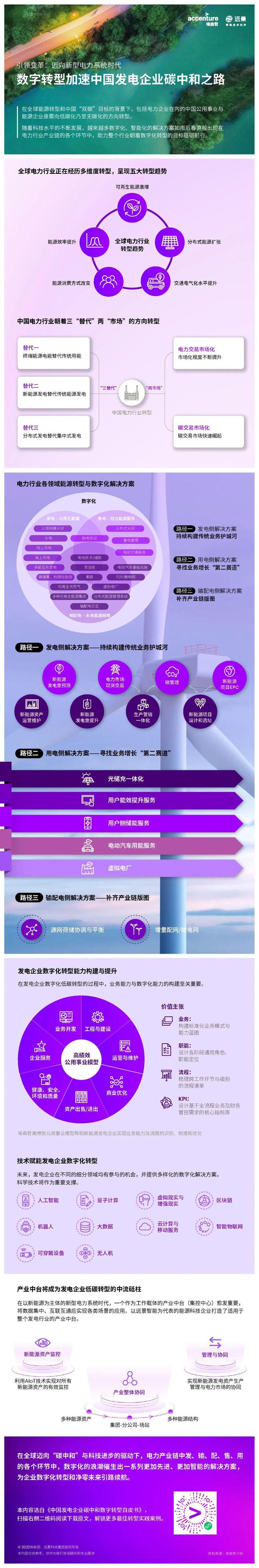 為了應(yīng)對未來更加“碎片化”的能源系統(tǒng),滿足消費(fèi)者日益迭代的需求,埃森哲攜手遠(yuǎn)景發(fā)布的《中國發(fā)電企業(yè)碳中和數(shù)字轉(zhuǎn)型白皮書》勾勒了發(fā)電企業(yè)圍繞發(fā)電、輸配電和用電全產(chǎn)業(yè)鏈構(gòu)建轉(zhuǎn)型路徑,并探討各類數(shù)智化解決方案的應(yīng)用場景。
