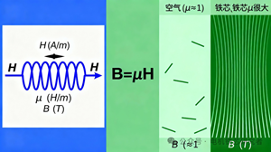 注:核心公式B=μH。左側(cè)線圈通電產(chǎn)生磁場強度H(外部驅(qū)動力),中間不同材料的磁導(dǎo)率μ決定響應(yīng)效率,右側(cè)產(chǎn)生的磁感應(yīng)強度B(實際磁化效果)大小不同。相同H下,高μ材料產(chǎn)生的B更強,磁通Φ更大。